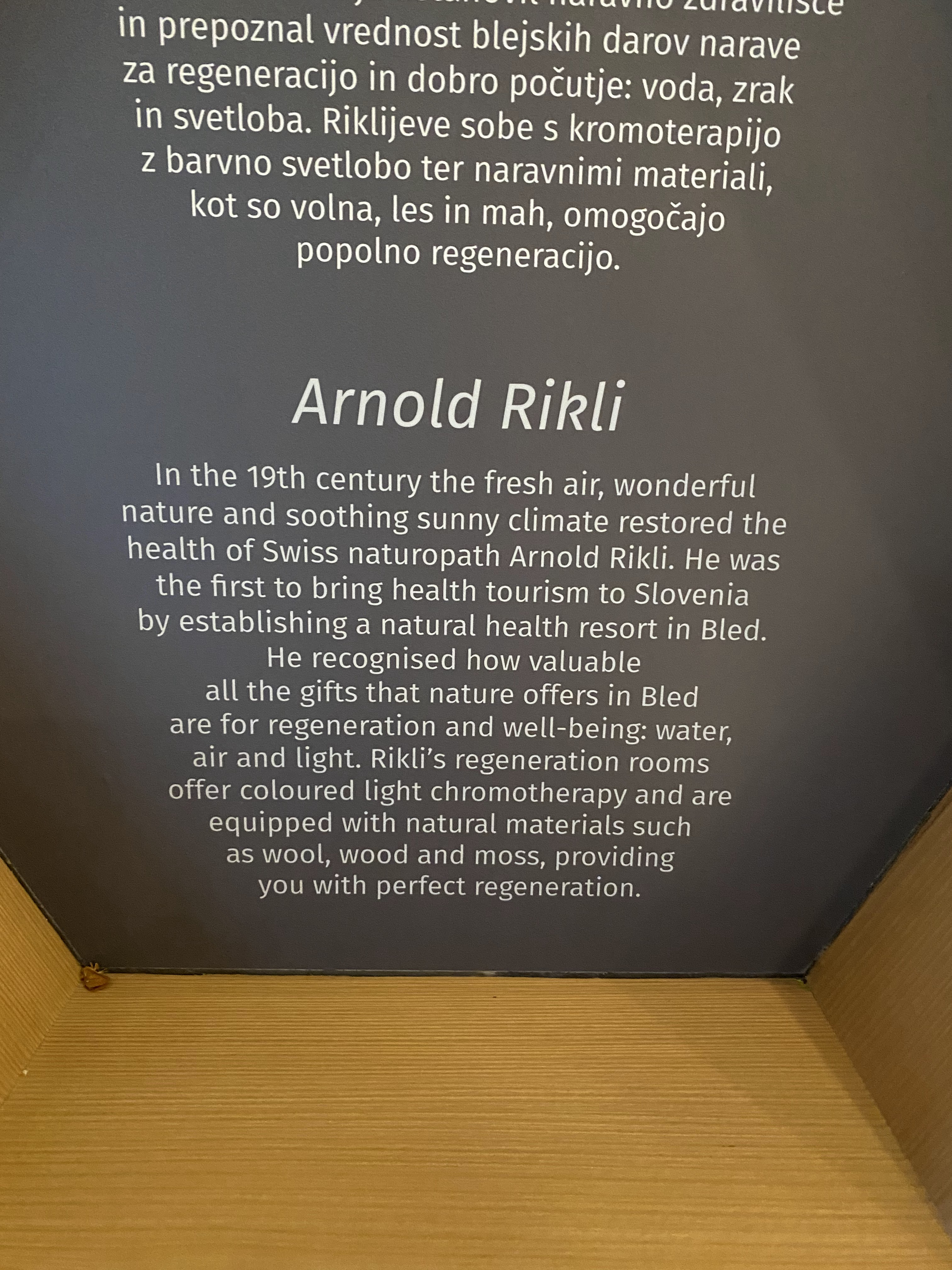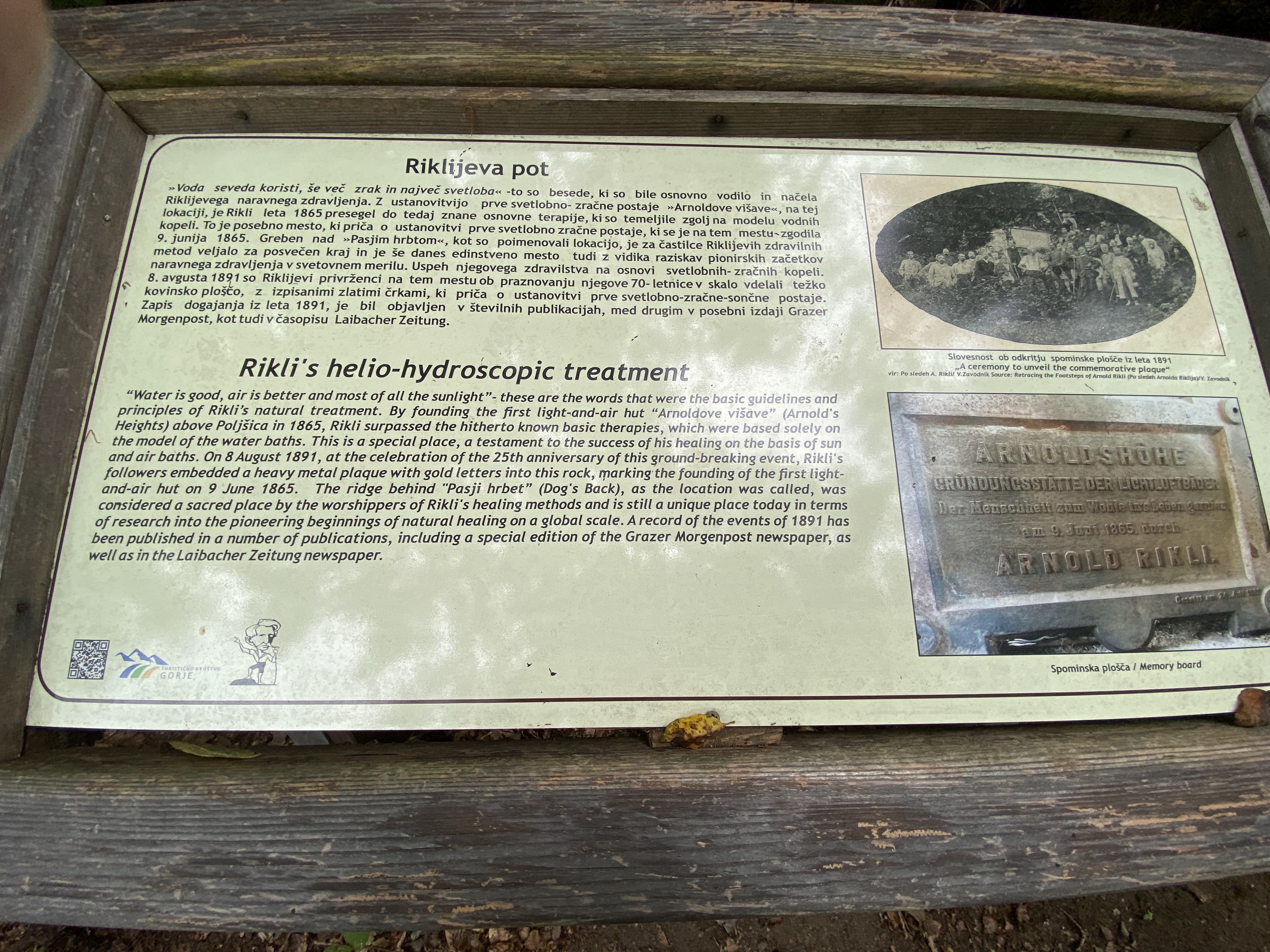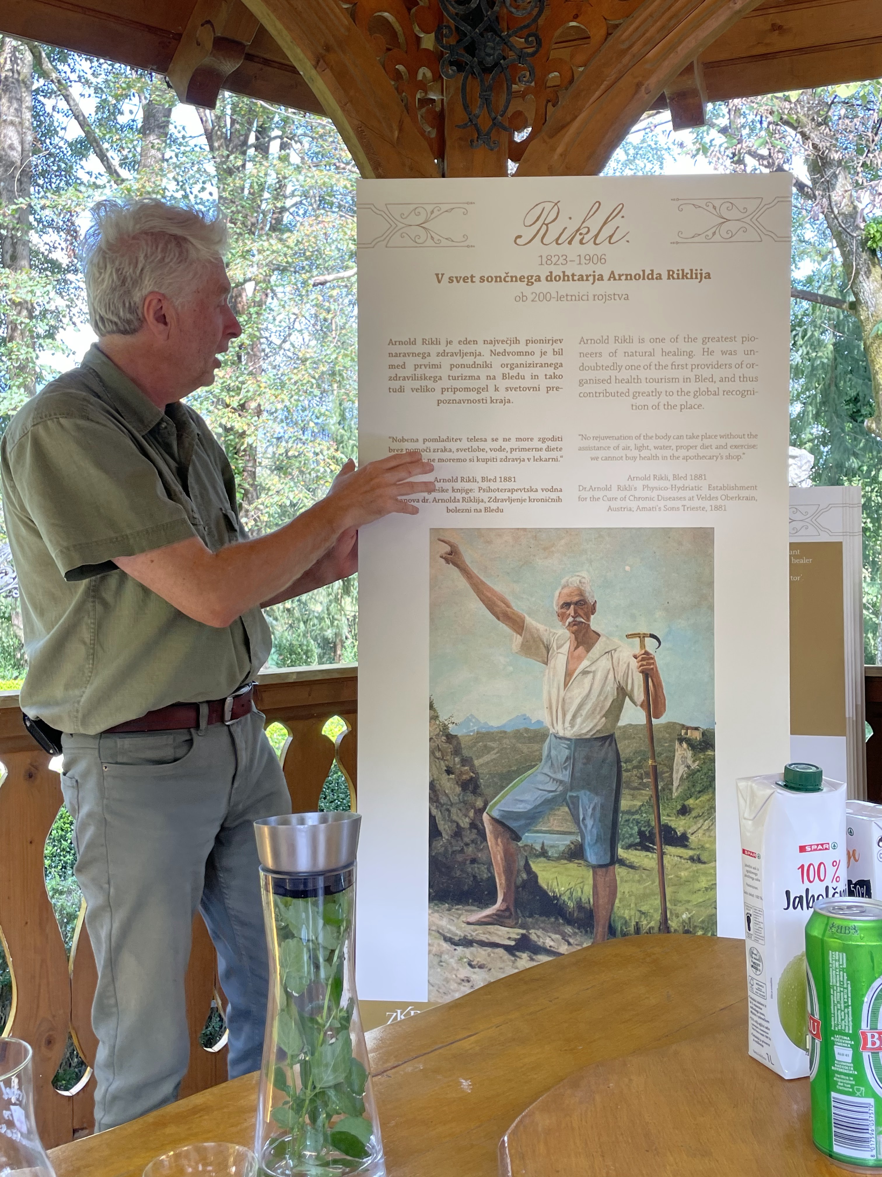 Old Arnold with cattleArnold walk # 5 plaqueArnold infoTrail markerOld Arnold leads the wayBled Castle at nightRikli Balance Hotel in BledRikli Balance Hotel explanationChuck, Arnold, Pat Sept 2023Pat, Vojko, Chuck Sept 2023Young ArnoldVojko with Arnold walking sticksVojko with Arnold thru the yearsArnold as child, through the years, in WangenArnold summaryArnold’s sniper rifle from 1841Reviewing Arnold’s lettersChuck, Pat, Arnold, Angela Sept 2023Ruins of Arnold’s VillaSign in front of Rikli VillaDisplay in Arnold’s room in the Bled CastleArnold MottoSign at Castle entry