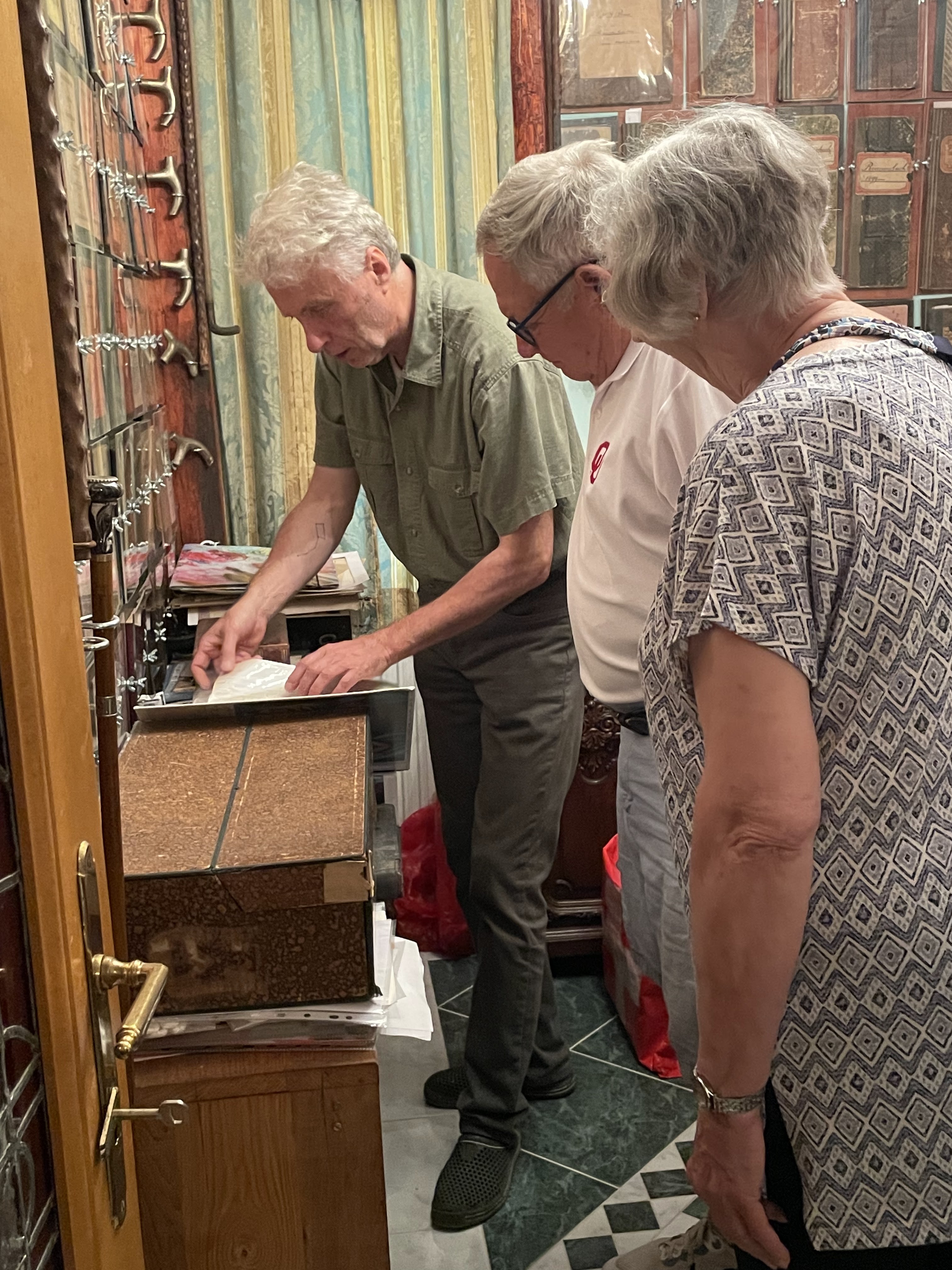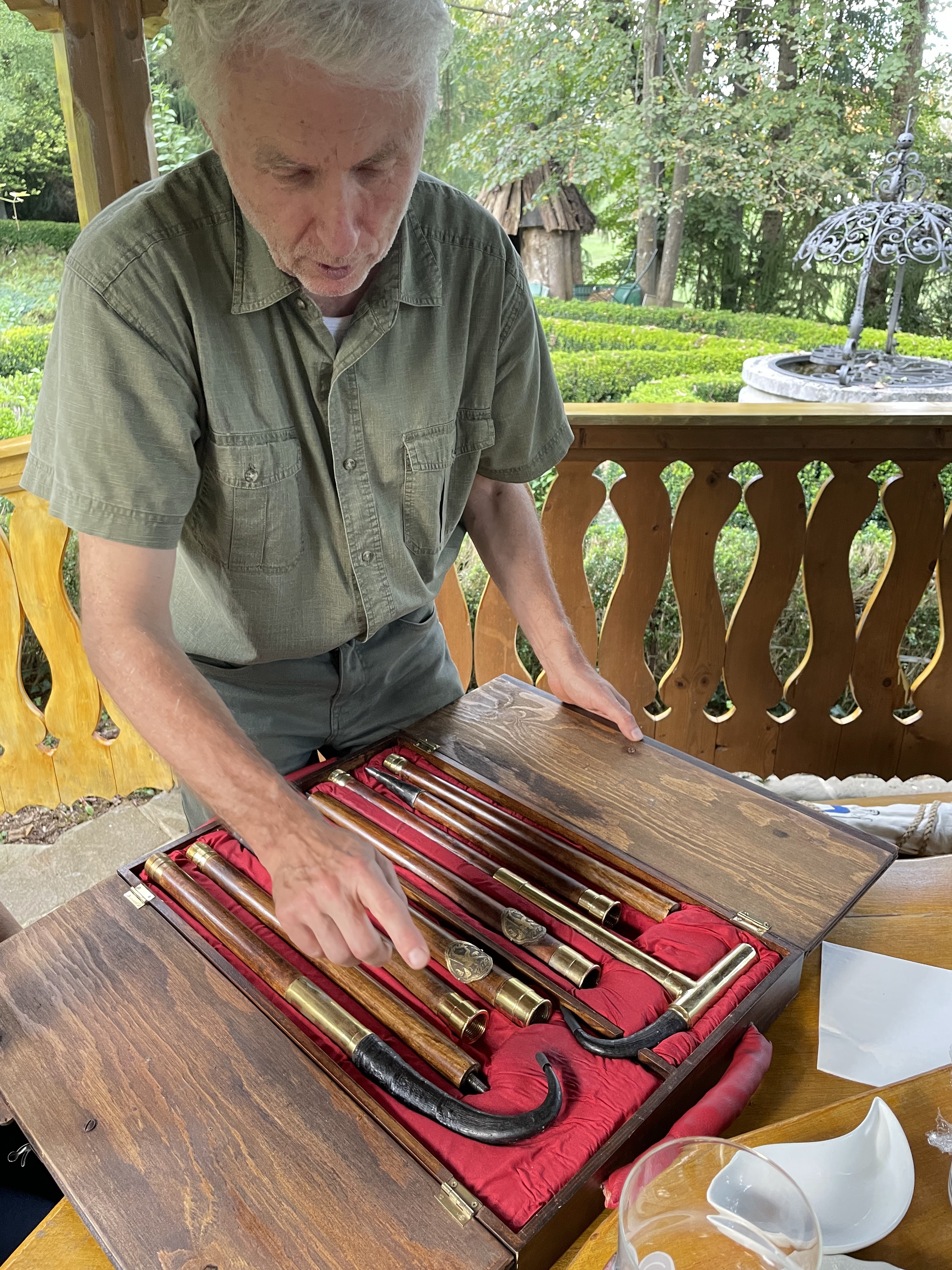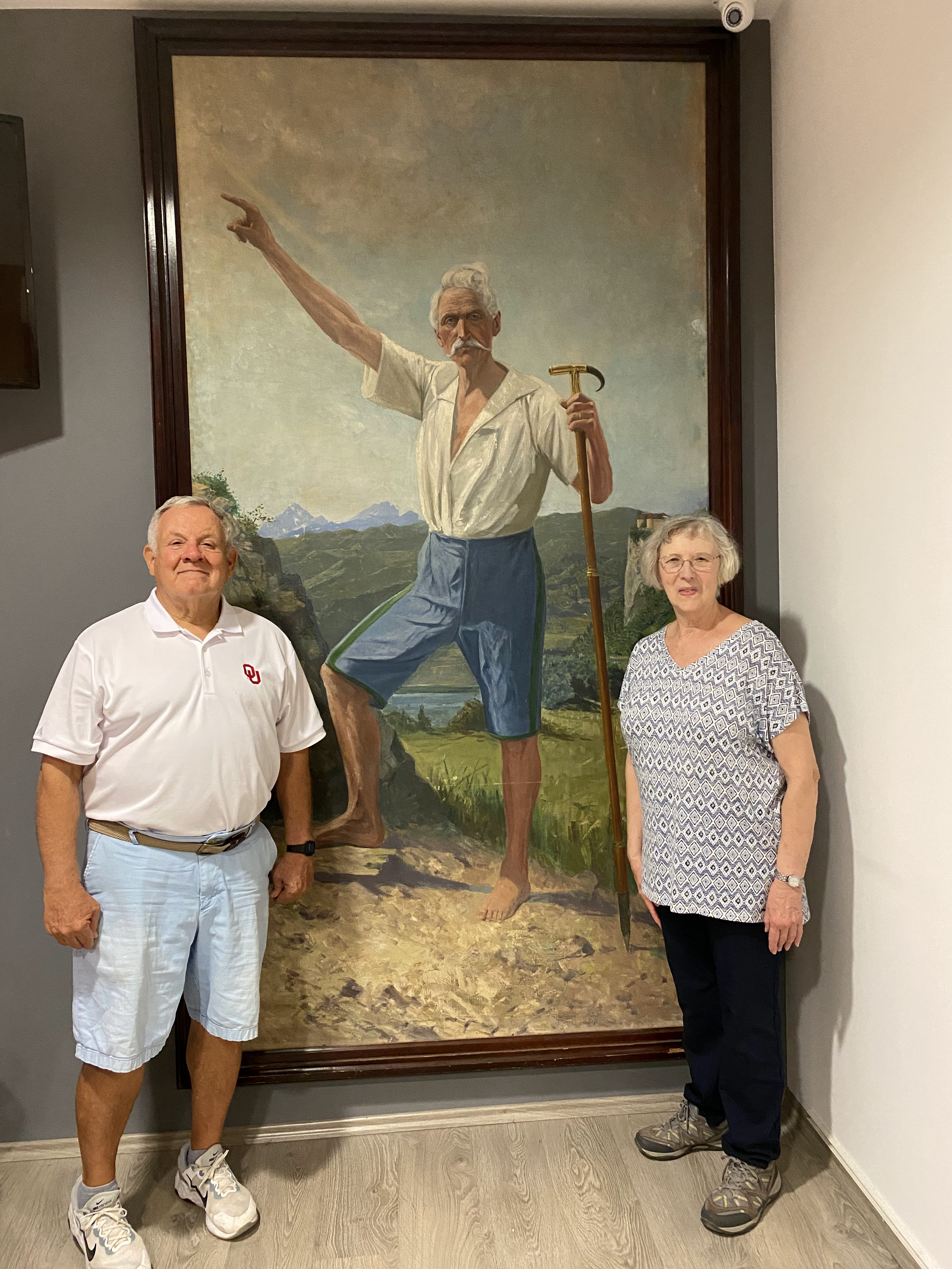 Old Arnold with cattleArnold walk # 5 plaqueArnold infoTrail markerOld Arnold leads the wayBled Castle at nightRikli Balance Hotel in BledRikli Balance Hotel explanationChuck, Arnold, Pat Sept 2023Pat, Vojko, Chuck Sept 2023Young ArnoldVojko with Arnold walking sticksVojko with Arnold thru the yearsArnold as child, through the years, in WangenArnold summaryArnold’s sniper rifle from 1841Reviewing Arnold’s lettersChuck, Pat, Arnold, Angela Sept 2023Ruins of Arnold’s VillaSign in front of Rikli VillaDisplay in Arnold’s room in the Bled CastleArnold MottoSign at Castle entry